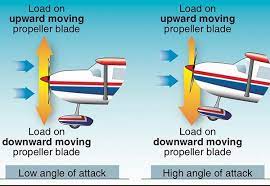 왜냐 하면 항공기는 수평이 되도록 움직이면, 내려가는 쪽의 Propeller Blade는 올라가는 쪽의 Blade 보다 더 많은 Angle of Attack 인 상태이다. 추가로 아래로 내려가는 쪽 Blade 는 올라가는 쪽 Blade 보다 더 많이 움직이고 더 많은 공기를 가르게 된다.