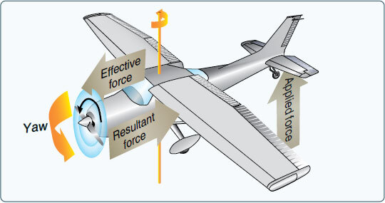 SLIPSTREAM EFFECT 시계 방향으로 PROPELLER 가 회전 하면 (COCKPIT에서 보았을 때), SLIPSTREAM 이 시계 방향으로 회전 하도록 하여 항공기 뒤 쪽으로 나선형의 형태로 흘러가게 된다. 이 현상이 비대칭형의 AIRFLOW 를 만들고 VERTICAL STABILIZER 와 RUDDER 를 치게 된다. SINGLE ENGINE 항공기가 높은 POWER 상태 일때, SLIPSTREAM 은 VERTICAL STABILIZER 의 왼쪽을 치게 되고, 항공기의 꼬리를 오른쪽으로 미는 AERODYNAMIC FORCE 를 만들어 내어 항공기가 YAW 하게 만든다. 몇몇의 항공기는 OFFSET VERTICAL STABILIZER 형태로 만들어져 이 EFFECT 를 극복 하도록 만든다. 이 현상은 HIGH POWER 와 저속에서 두드러 진다.
